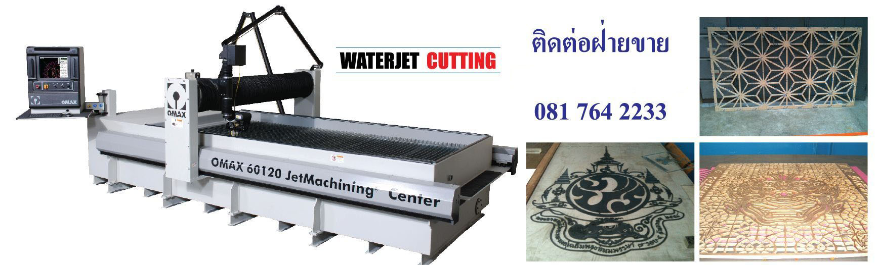 Waterjet Cutting ค่าใช้จ่ายในการใช้งานระบบนี้มีราคาถูกกว่าแบบ Laser และไม่ก่อให้เกิดรอยจากความร้อน ซึ่งเหมาะที่จะใช้กับพวกโลหะแข็ง บริการรับตัดชิ้นงานด้วย เครื่องตัด WATER JET (เครื่องตัดวัสดุด้วยกำลังน้ำ) ขนาด 5 ฟุต x 10 ฟุต (3048 x 1524 มม.) ตัดได้หนาสุดถึง 4 นิ้ว ควบคุมด้วยระบบคอมพิวเตอร์สามารถตัดรูปแบบ โลโก้ รูปสัตว์ ตัวอักษร ตัวเลข ฟันเฟือง อะไหล่ชิ้นส่วนเครื่องจักร และรูปแบบต่างๆ ตามที่ลูกค้าต้องการ สามารถตัดวัสดุที่เป็นเหล็ก สแตนเลส อลูมิเนียม อลูคาร์บอล ทองเหลือง ทองแดง อะคริลิค พลาสติก แผ่น PE แผ่นยางไม้ แกรนิต หินอ่อน ไทเทเนียม ปะเก็น แผ่นชิฟ และวัสดุแผ่นเรียบทุกชนิด